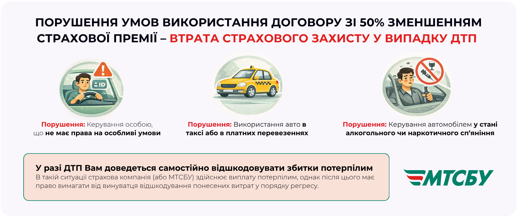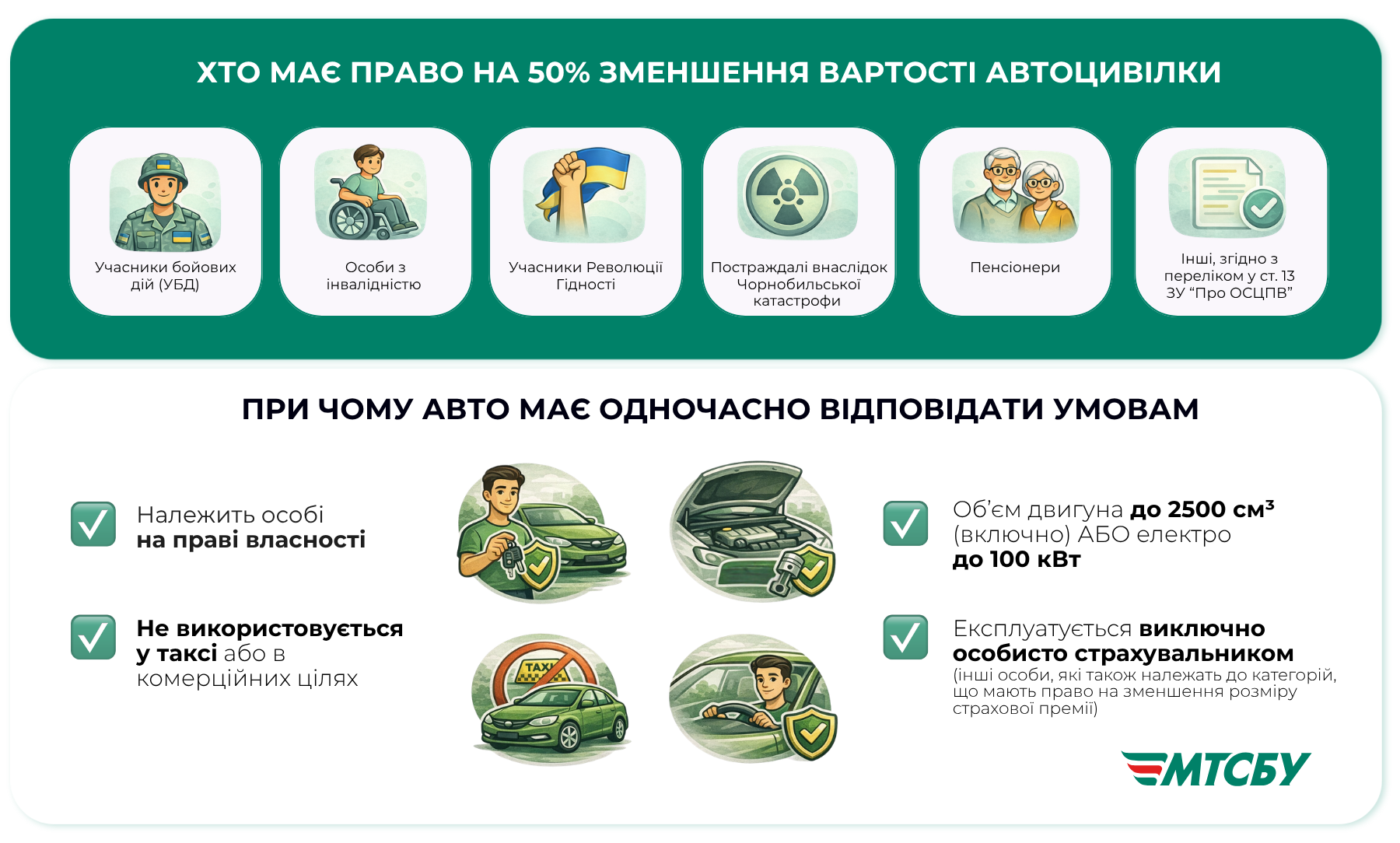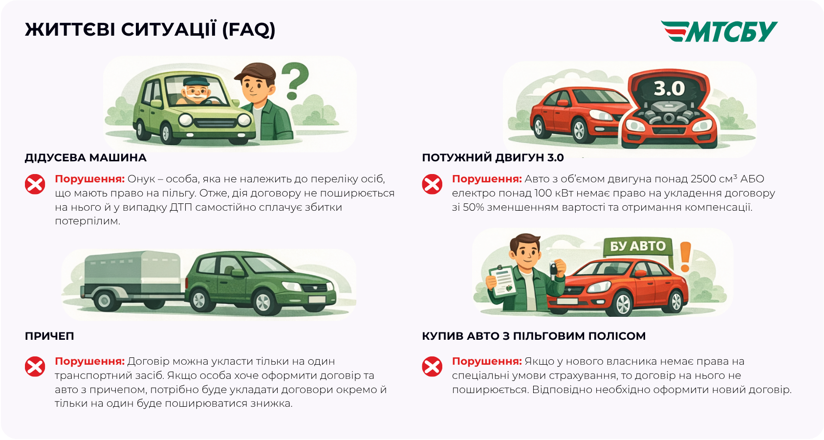 ⚠️ Зверніть увагу: Особа, яка має право на особливі умови, може укласти лише один договір страхування зі зменшенням розміру страхової премії на 50% . Якщо у вас два авто — на друге потрібно укладати договір за повною вартістю.