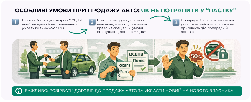 Рекомендація для покупця: Завжди перевіряйте умови, на яких укладено договір страхування при купівлі авто. Якщо він укладений за особливими умовами (застосовано зменшення розміру страхової премії на 50%), а ви не маєте права на такі умови — цей поліс для вас небезпечний. Укладіть новий договір одразу після купівлі транспортного засобу.