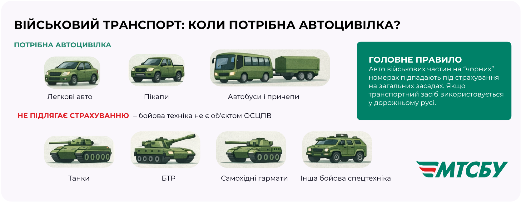 Якщо транспортний засіб належить військовій частині (транспортний засіб на "чорних номерах"), він також може підпадати під обов’язкове страхування. Проте, в цьому випадку договір зі страховою компанією укладає військова частина.