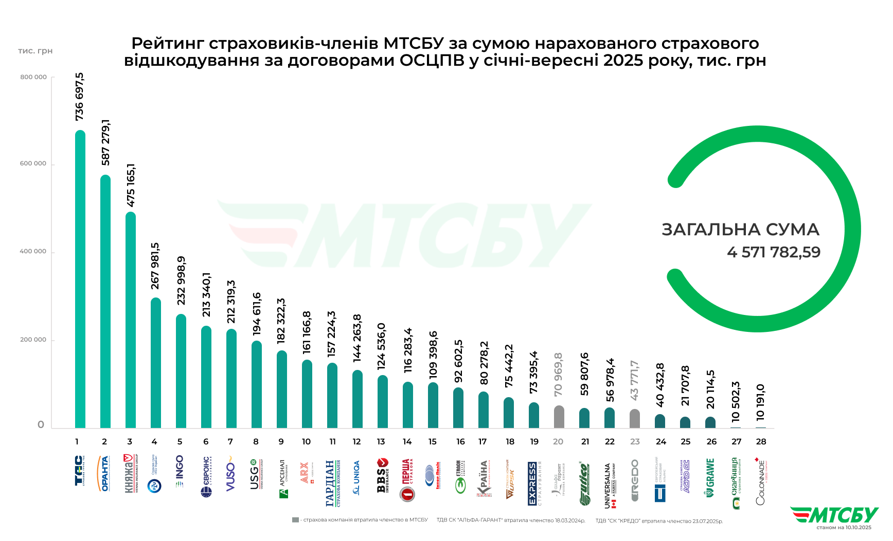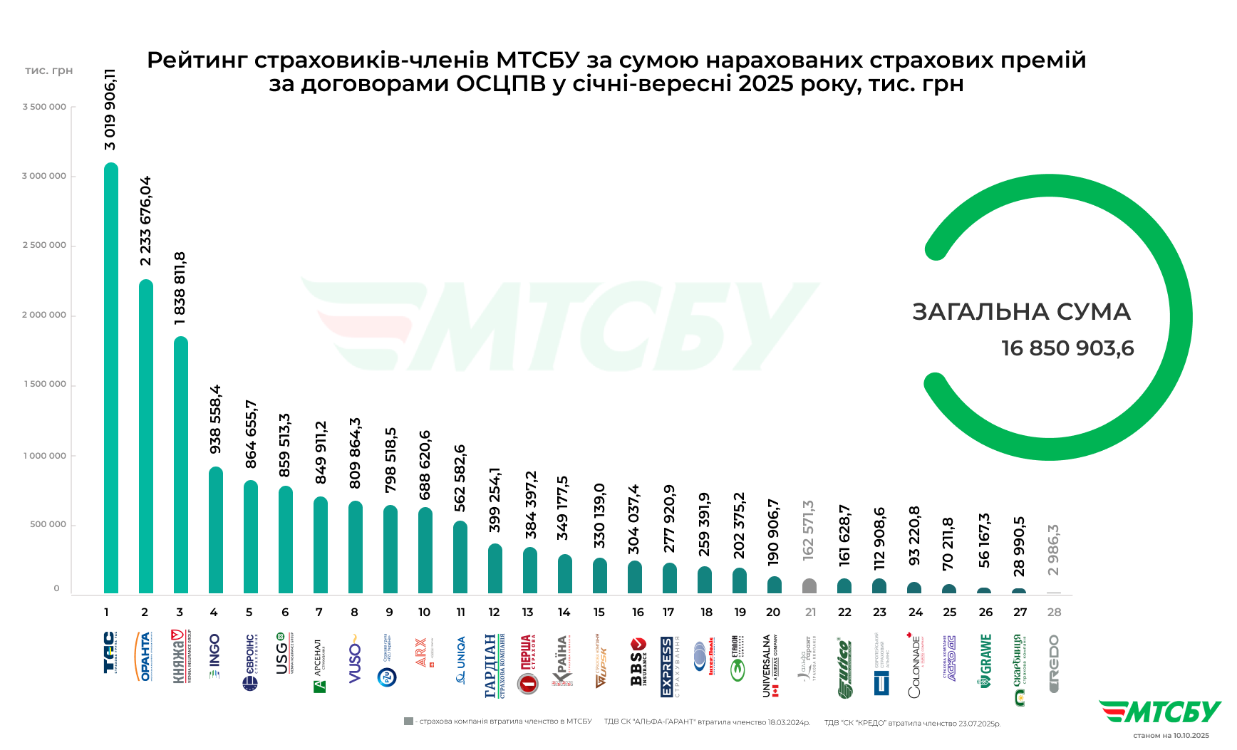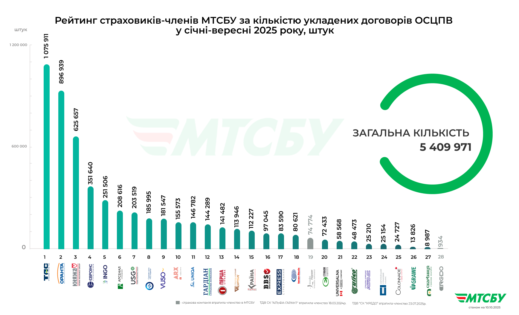 Лідером за кількістю укладених внутрішніх договорів ОСЦПВ за підсумками 9 місяців 2025 року стала страхова компанія «ТАС». Другу та третю позиції посіли відповідно СК «ОРАНТА» та СК «КНЯЖА ВІЄННА ІНШУРАНС ГРУП».