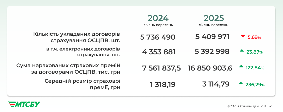 У підсумку, за січень–вересень 2025 року загальна сума нарахованих страхових платежів за внутрішніми договорами ОСЦПВ склала 16,85 млрд грн, що на 122,8% більше, ніж за аналогічний період 2024 року.
